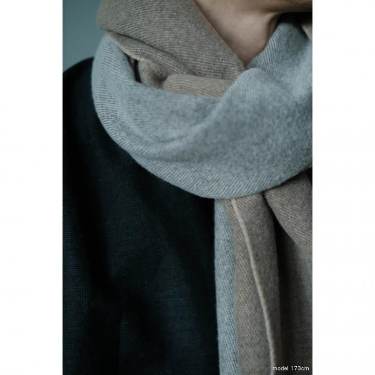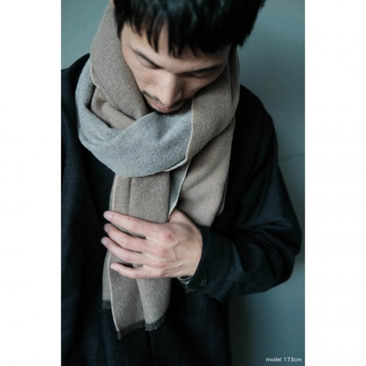 表裏がバイカラーなので、結び方で印象が大きく変わります。 ウルグアイ産のウール(U-ブリッド)はカシミヤ並みの繊維の細さを持ったメリノウールで、チクチク感の無い優しい肌触り、軽さ、温かさを兼ね備え、ファンも多い素材です。表裏の二重織にすることでふっくらと厚みのあるテキスタイルを、獣毛加工の上手な尾州(愛知県)で最終加工を行い、高級感のある仕上がりに。男女問わずお使いいただけるのでプレゼントにもお勧めです。