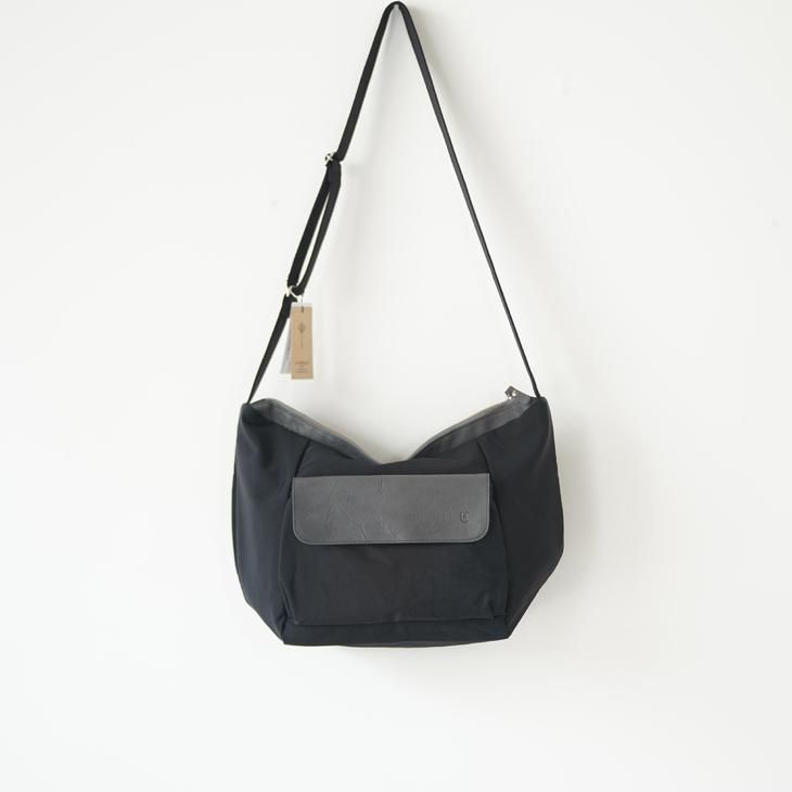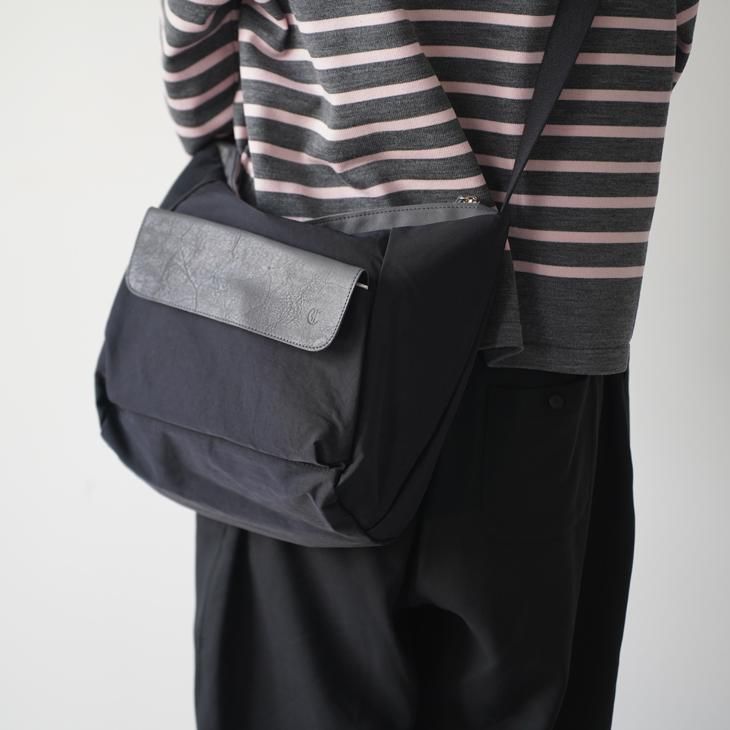 フロントの大きめのカウレザーのフラップがアクセントになったナイロン&レザーのミディアムサイズのショルダーバッグ。前面のフラップポケットに小物をたっぷり収納でき、背面と内側にも収納ポケット付き。