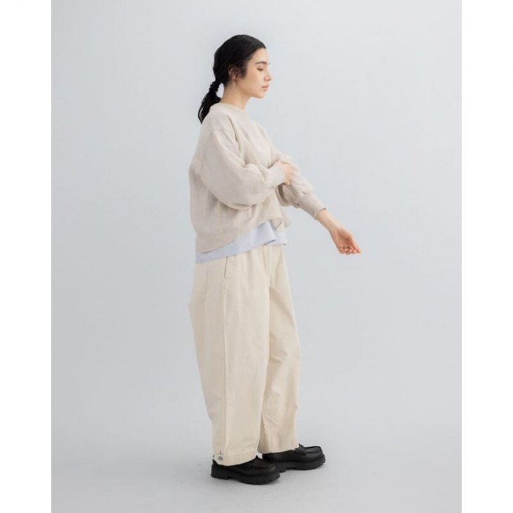 ナチュラルなベージュと綿部分のサックスブルーの配色が綺麗で、 袖部分はリブで仕様、前後2wayで着用いただけます。