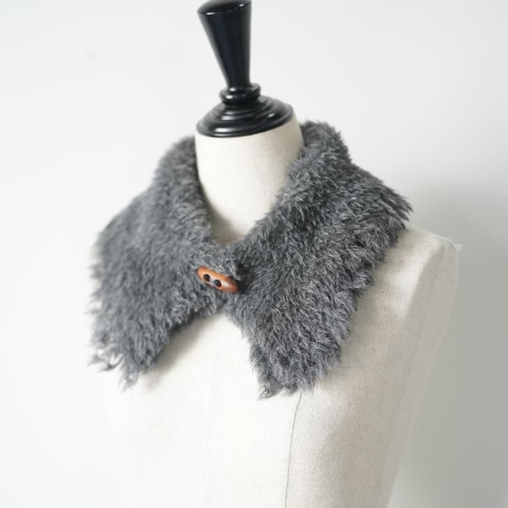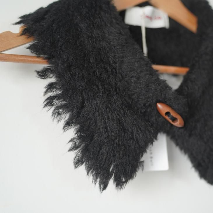 開閉には存在感のあるウッドボタンを付けました。毛足が長くふんわり感が華やかで素敵です。コーディネートを引き立てる1点です。