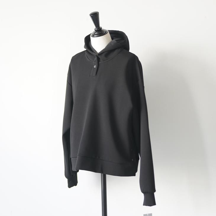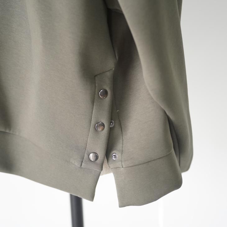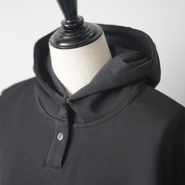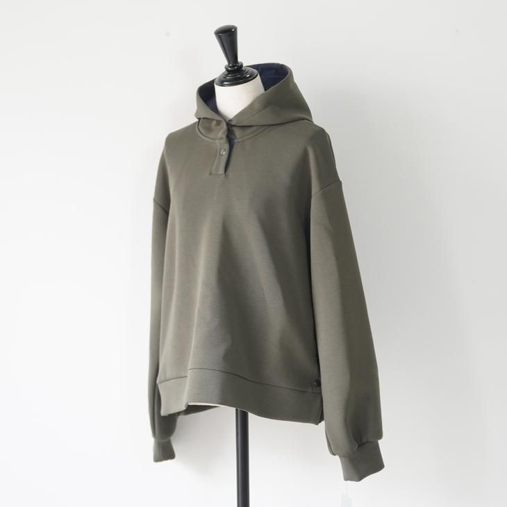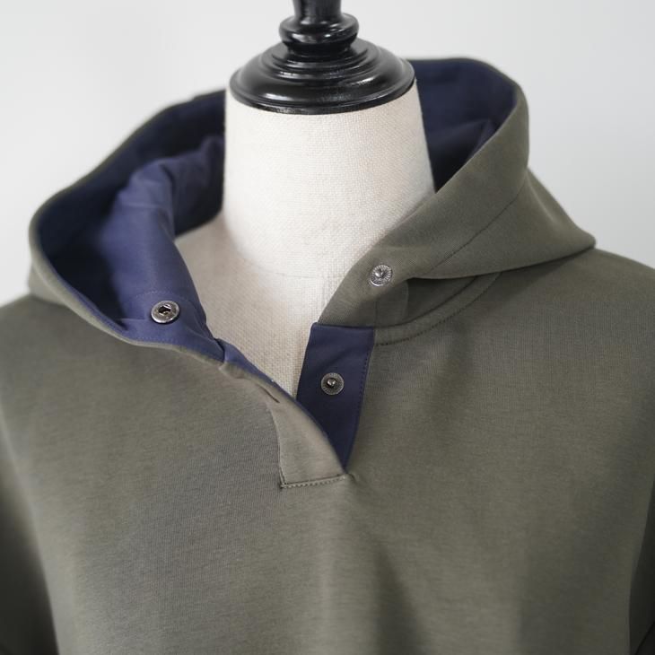 ストレッチ性があり、さらっとして着心地の良いダンボール素材のフードパーカー。裾両サイドはスナップボタンで開閉できるます。フード裏側は別布仕様となっています。程よい肉厚とサイズ感なのでデイリーの着用におすすめです。