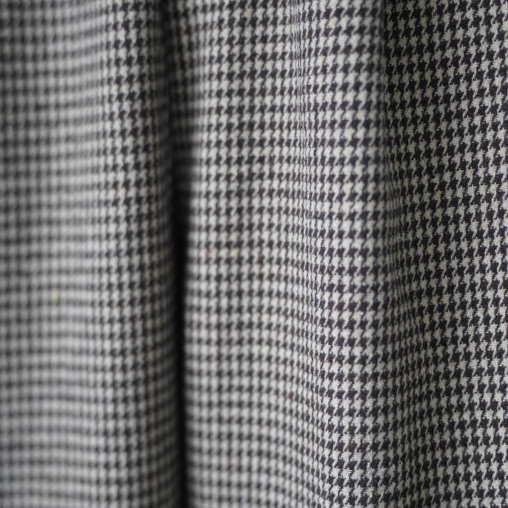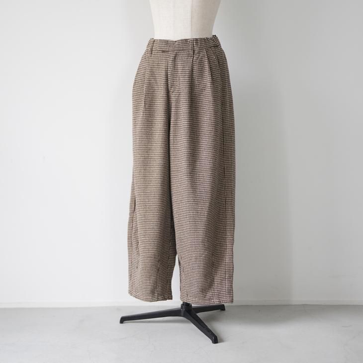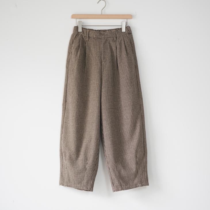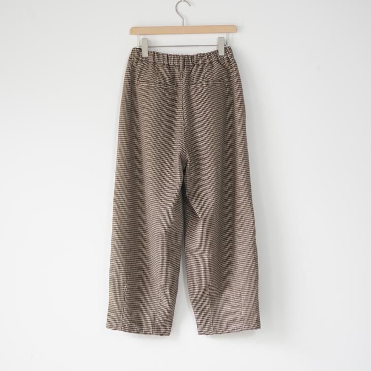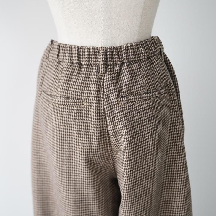 ヴィンテージライクな千鳥柄の2タックワイドパンツ。起毛感のあるポリエステル素材のウォーミーなボトムス。ウエストゴムギャザーでとても履き心地が良いアイテム。フロントはZipファスナー仕様。