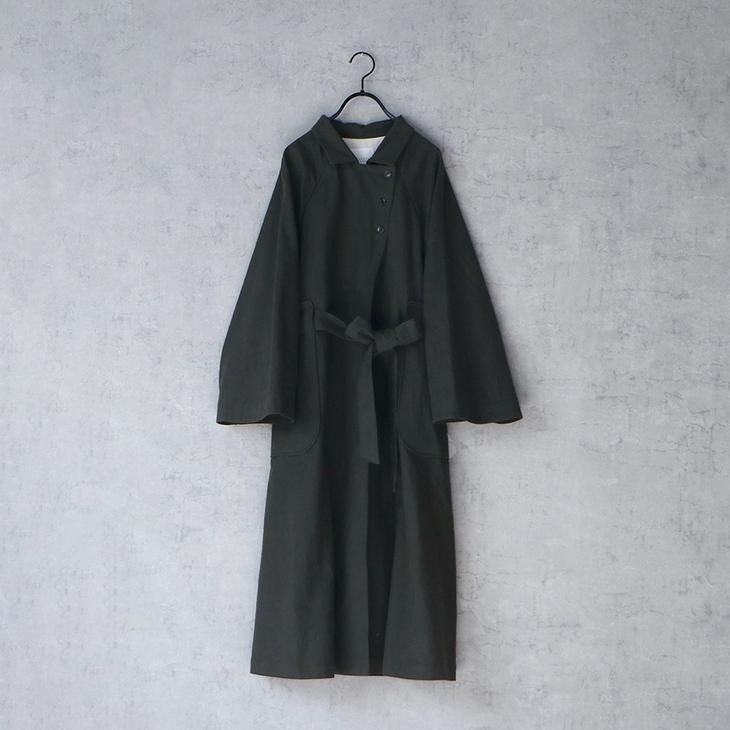 お袖はラグランスリーブになっており、 袖口になるにつれて緩やかに広がります。 両サイドあしらった大きなポケットは、 ウエストのベルトの通し口を兼ね備えており、ベルトを外して着用しても様になる仕組みです。