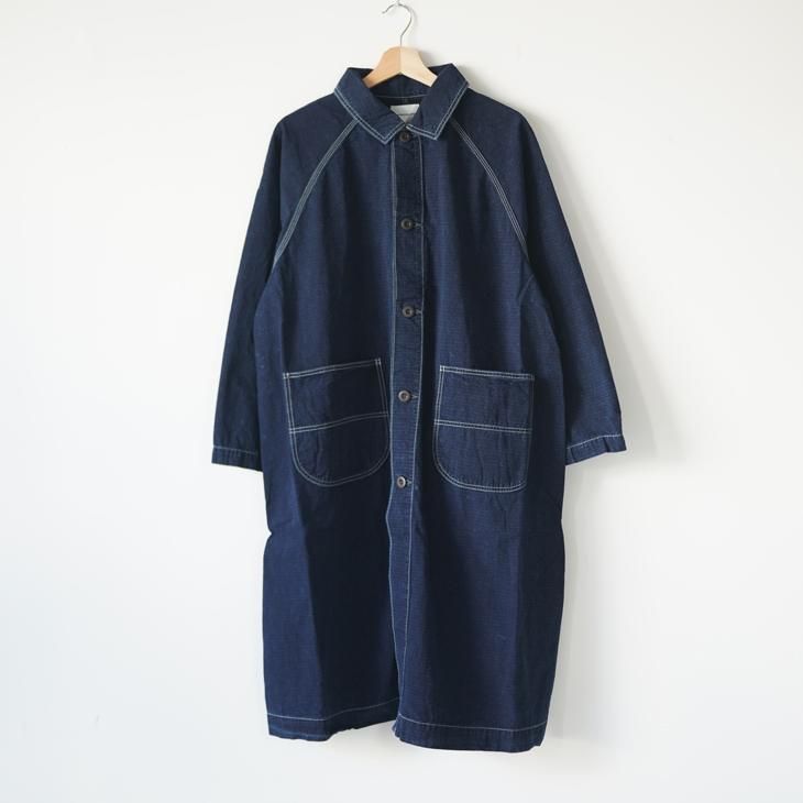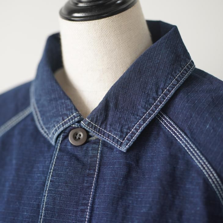 ポケットやラグラン袖、裾、袖のステッチ使いがアクセントとなったライトオンスのインディゴ・コート。ゆったりめのシルエットなので、寒い日はニットなどもインナーに着用できたり、涼しい日には羽織としても着用いただけます。