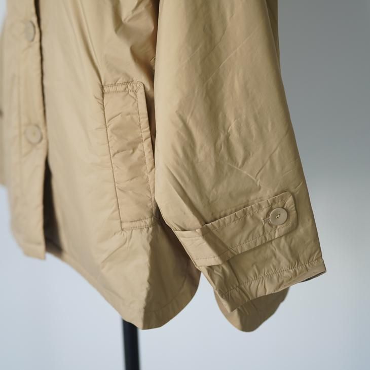 軽くてあたたかな機能素材を、ポンデらしいデザインに落とし込みました。くるみボタンのアクセントや、サイドの裾のテール、後ろ姿のムードなど、アウトドアアイテムにはないフレンチシックな佇まいを大切にしました。