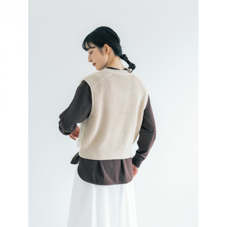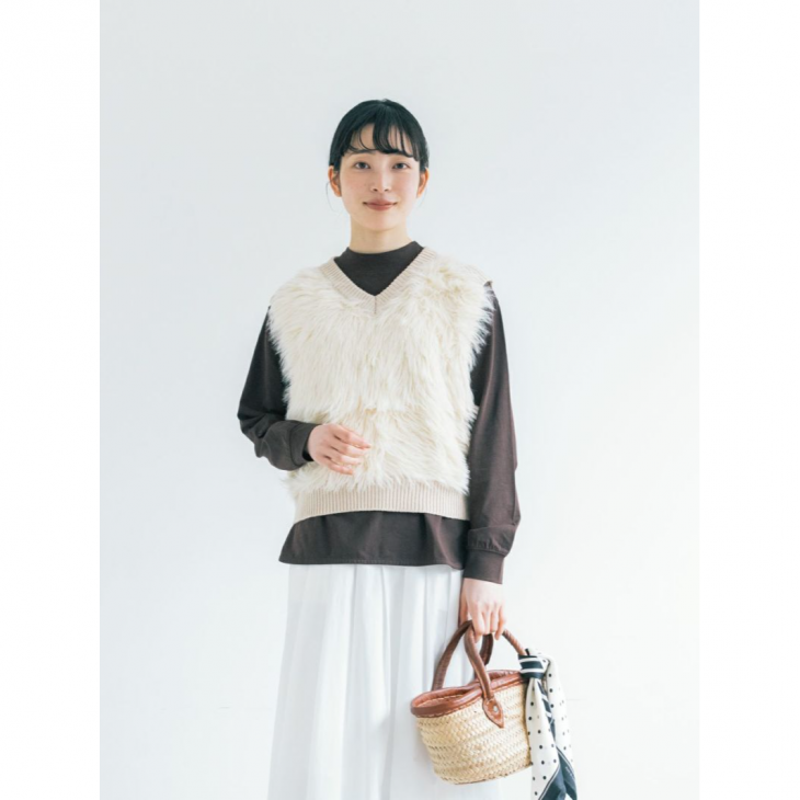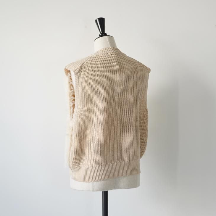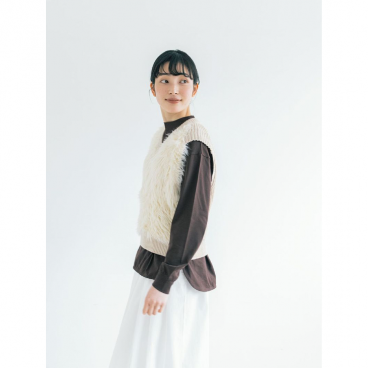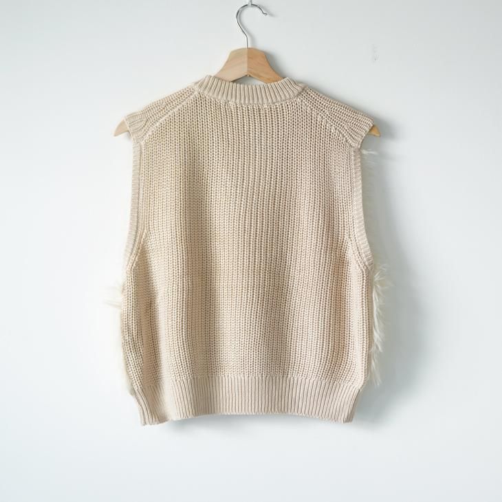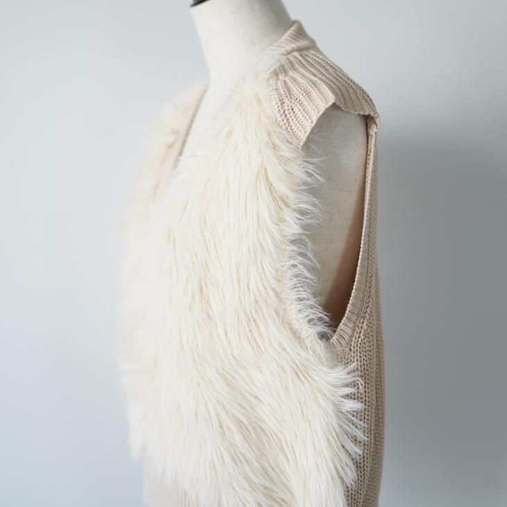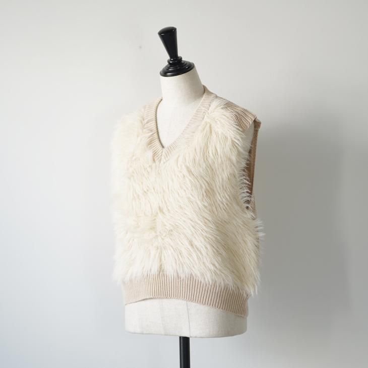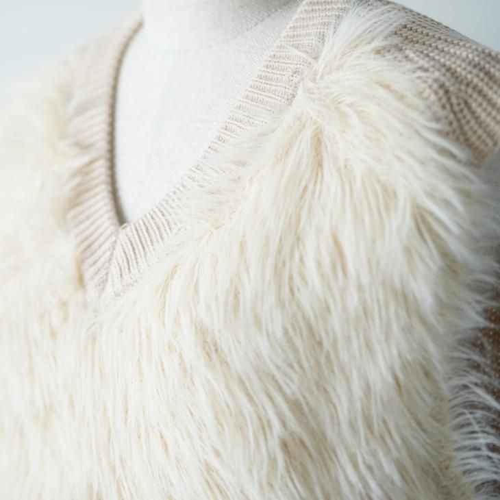 毛足の長いシャギー糸をファーのように編み込んだニットベスト。