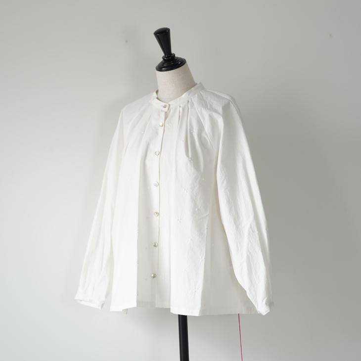 STAMP AND DIARY | papu 刺繍 スタンドカラータックブラウス (シロxシロ) | スタンプアンドダイアリー 40/1 シワタイプライター