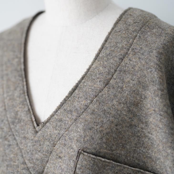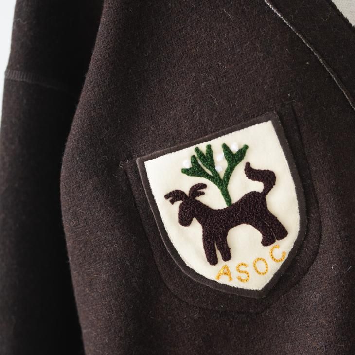 生地は糸芯にナイロンを混紡することにより伸縮性と強度を産み出しているやわらかな毛質のラムウールを使用したカットソー生地。ローゲージの編機で天竺を貼り合わせるようにナイロンでつないでいる為、リバーシブルな生地になっています。通常のソーピングとは違い、少し高い温度で長時間生地をソーピングしているので、その後に低温のタンブラーを施して、よりふっくらとした仕上がりにしています。トップスの方にのみ、オリジナルで作成した校章ワッペンが付いています。