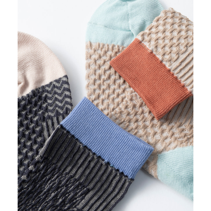 伸縮性がある凹凸組織は足が小さめな方が履くと立体的な柄に浮き上がり、足が大きめの方が履くとフラットな柄に変化。