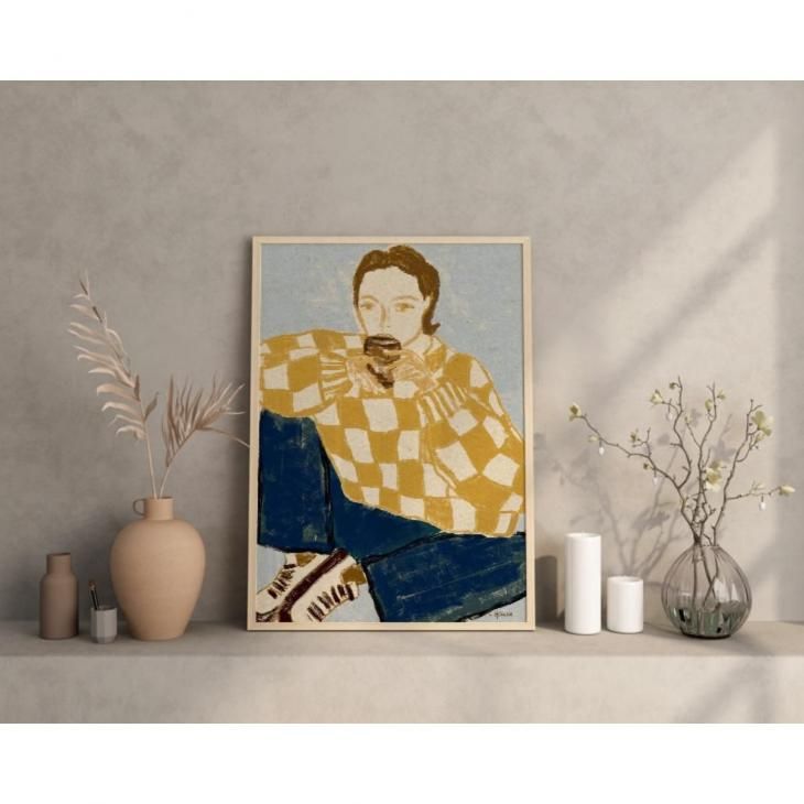 こちらのポスターは座って、何か計画を立てている女性の1シーンを描いた心温まる、優しい色使いのポートレートアート。