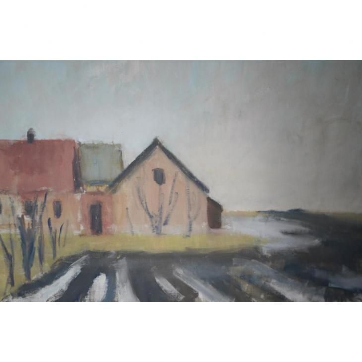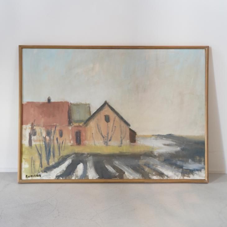 スウェーデンの画家、グスタフ・ルードバーグによる風景を描いた油彩。 淡く抽象的に描かれた建物と自然の調和が見事な穏やかな作品。