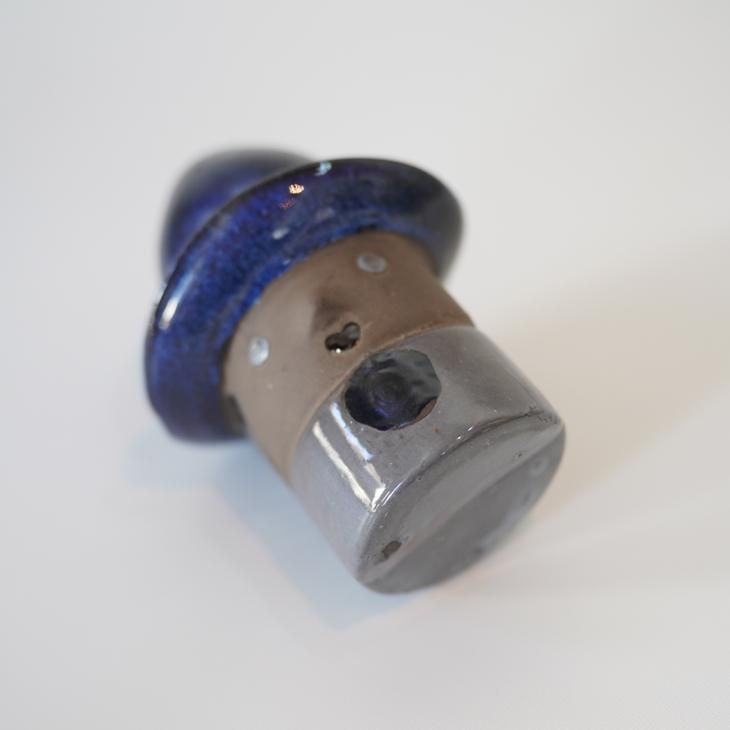 とても不思議な雰囲気の帽子の男性をモチーフにしたスウェーデンの置物。粘土地の顔、曲線のフォルムが絶妙なハット、ブラウンヘア、グレーの服(台座部分)の細部にこだわりを感じさせるアイテム。