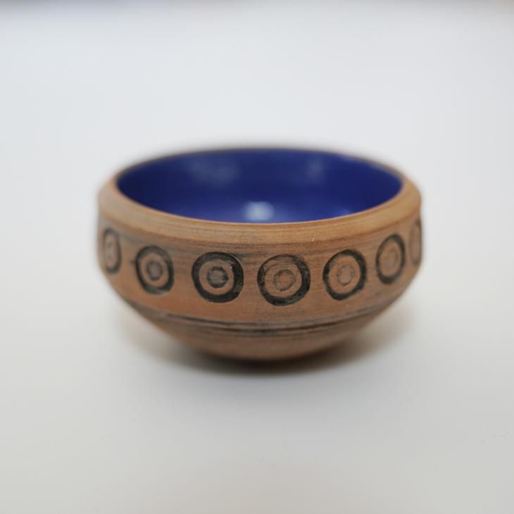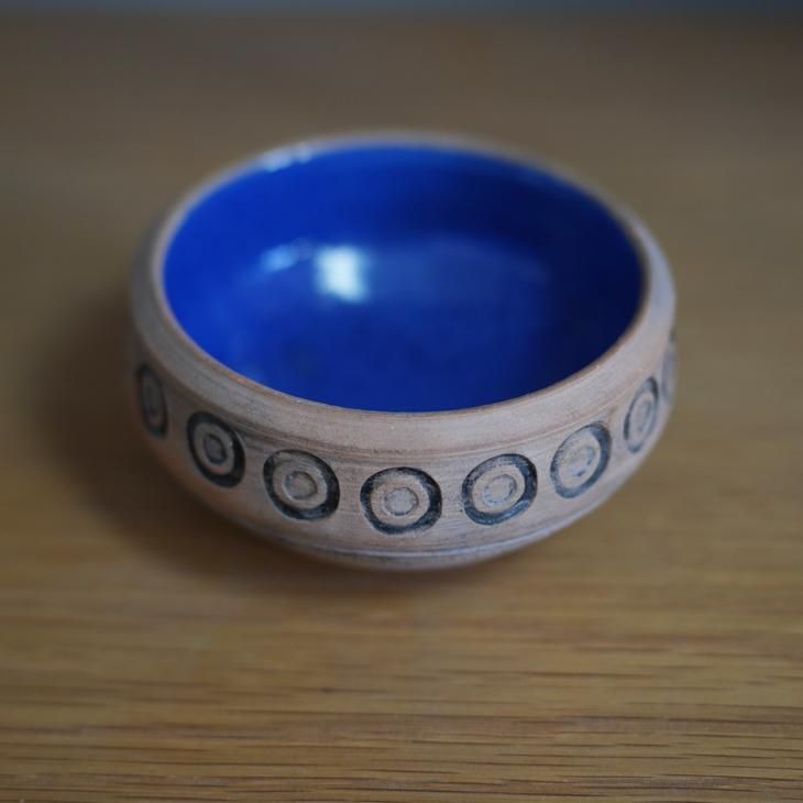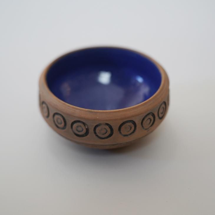 内側にはコバルトブルーの釉薬が施され、テラコッタの素焼きの外側にはリズミカルなサークルの模様が施された北欧の伝統的なフォークロアと幾何学模様を組み合わせたのアイテムです。鮮やかなブルーの内装は北欧の空や海を想起させてくれます。