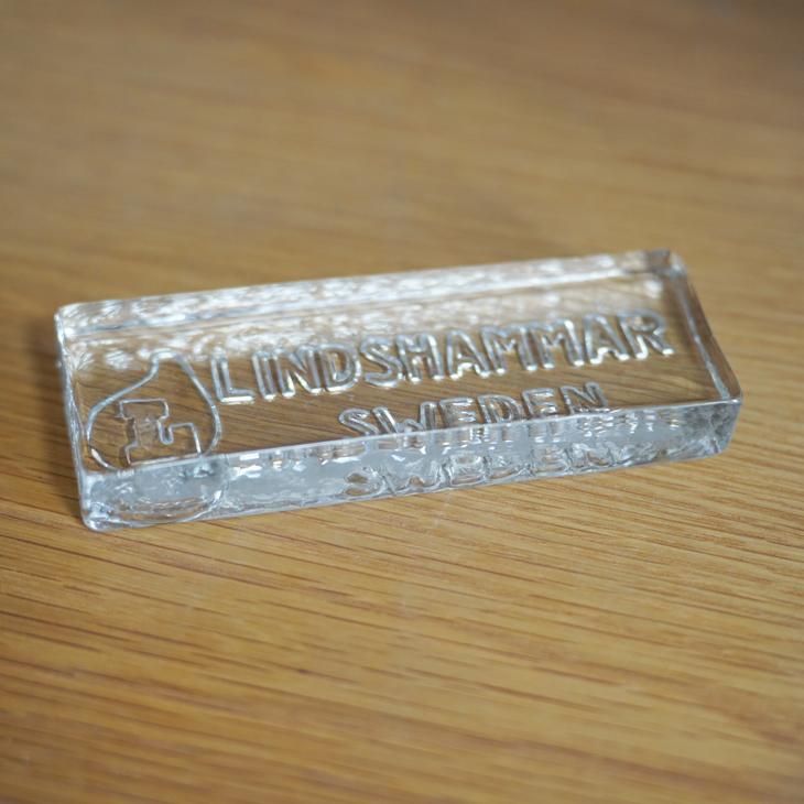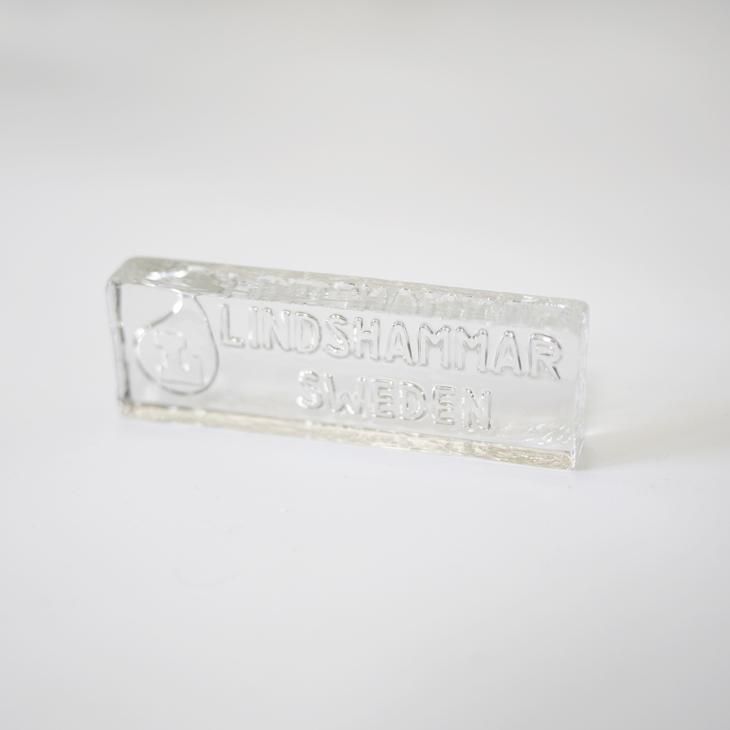 スウェーデン・スモーランドのガラスメーカー「Lindshammar Sweden」のガラス製広告ブロック。背面には「Lindshammar Sweden」の銘文と、水滴の中に収められた象徴的な「L」の刻印が施されています。