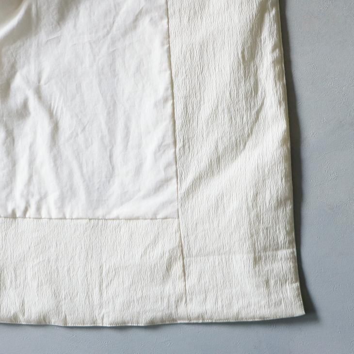 素材は、縦糸にコットンリネン、横糸にナイロンを織り込んだファブリック。 クシュクシュとしたシワがビンテージ感、ドライな質感で在りながら 肌当たりは軽やかです。