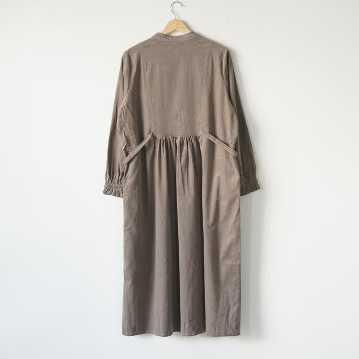 ダークで着合わせやすい無地コーデュロイのカラーと、同⾊系でバランスよく合うLIBERTYPRINTを選びビブヨークとくるみボタンに使用しました。ノーカラーPOタイプのワンピースのウエスト部分で切替え、前後ビブヨーク部分にギャザーを入れています。ウエストのDカン付きの紐でシルエットチェンジをしていただけます。