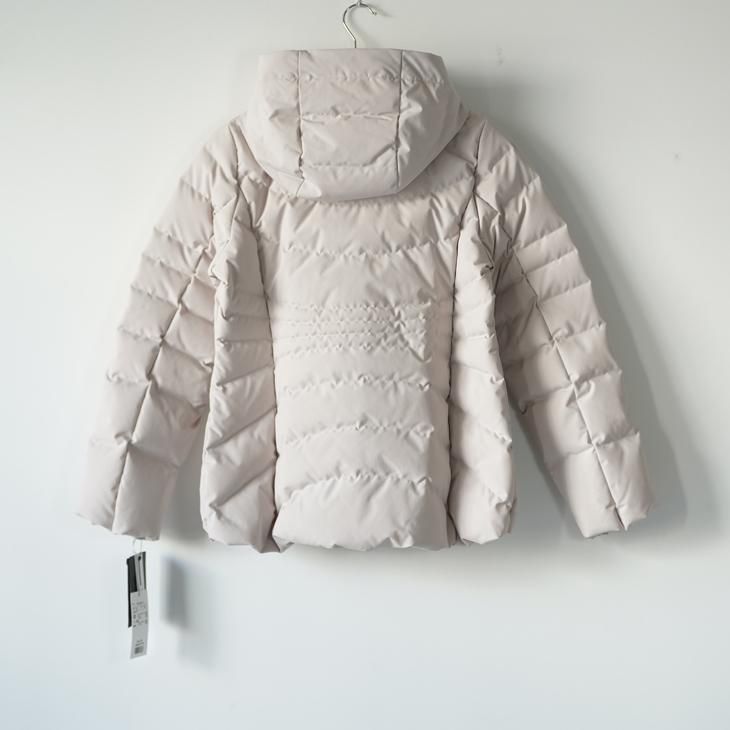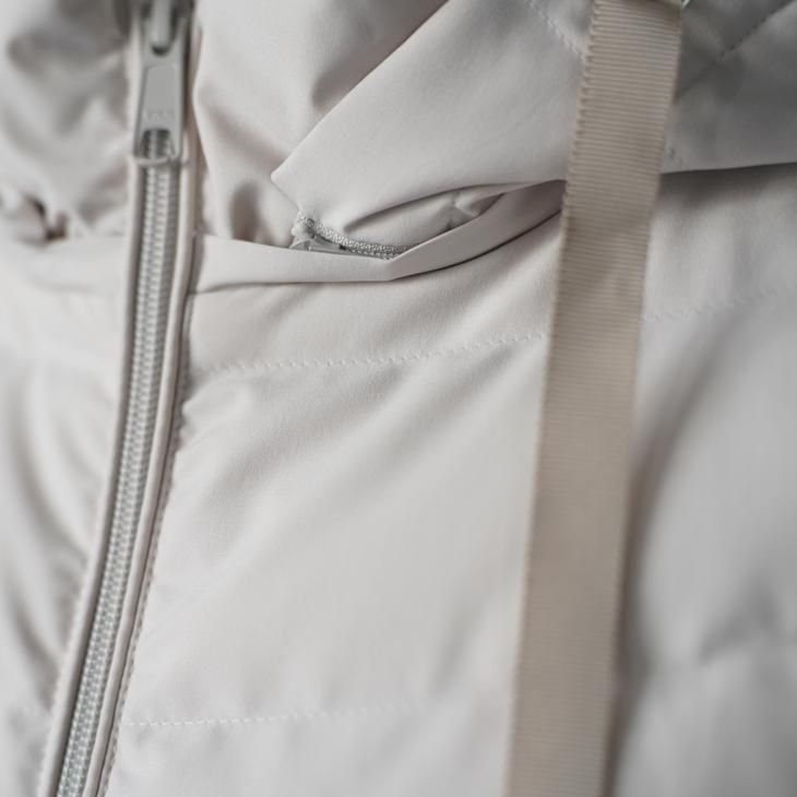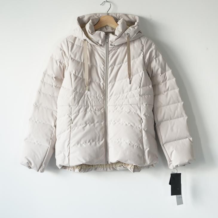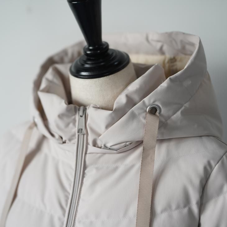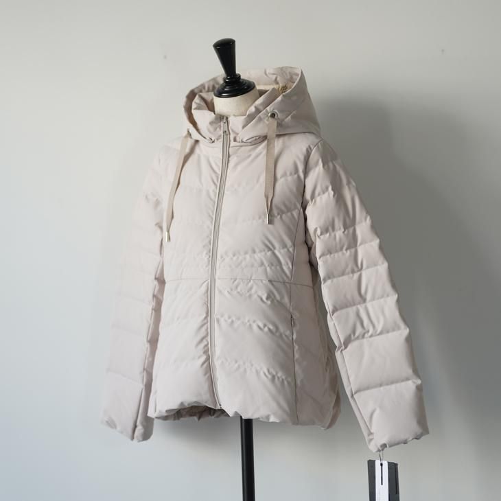 マットな質感の表地と落ち着いたオフホワイトの色味がとても女性らしさのあるフーディー・ダウンジャケット。オーストラリアのVICTORIAダウンを使用した保温性、程よい膨らみで冬の寒い日をおしゃれに演出してくれます。