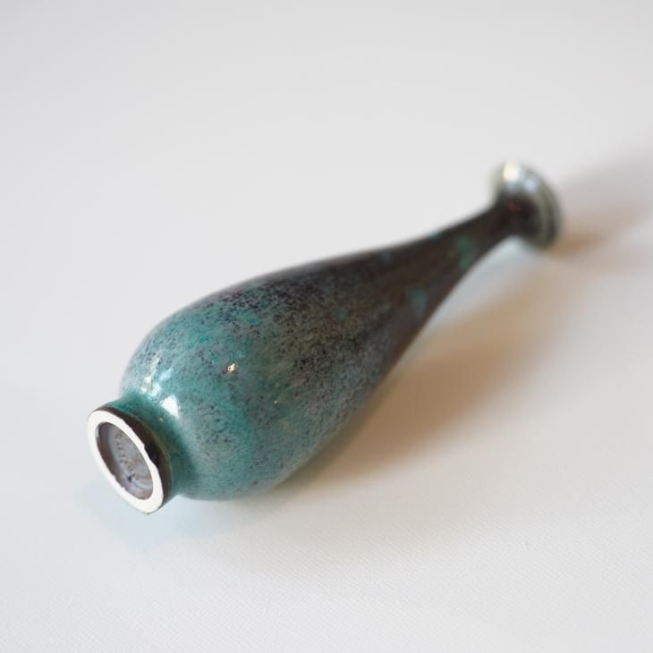 グスタフスベリにてたくさんの作品を手がけたベルント・フリーベリがデザインしたミニチュア・ベース。13cmと5.5cmの大小のベースのペアとなります。 ターコイズカラーのベースにブルーとダークパープルのアニアラ釉が施された、おそおらく1979年頃に製造されたもの。