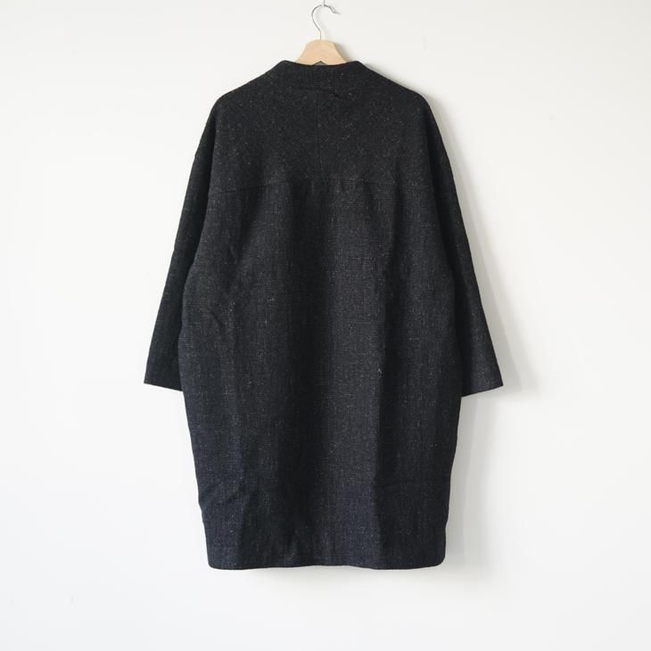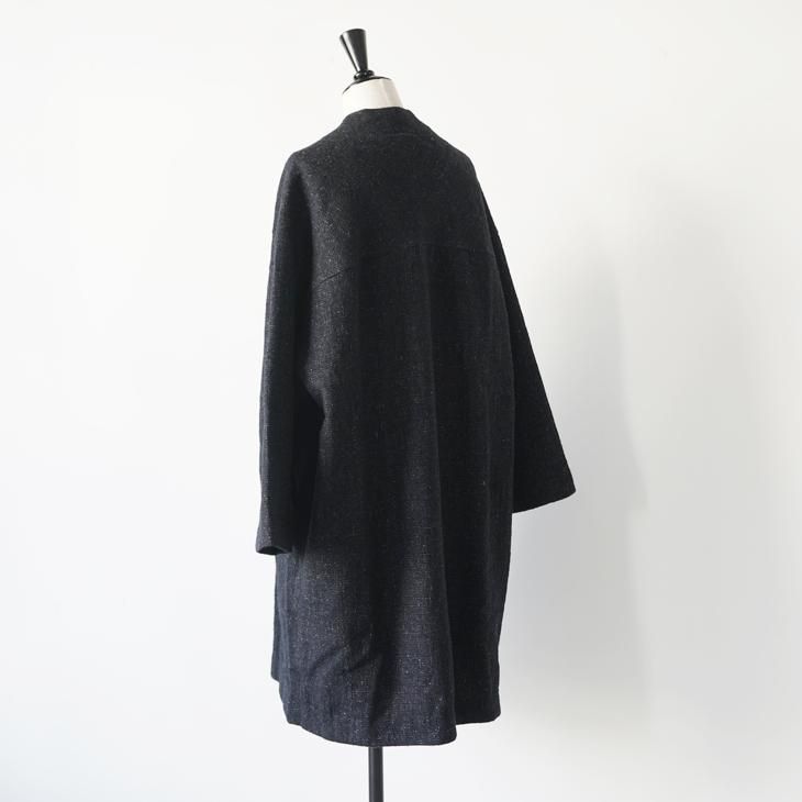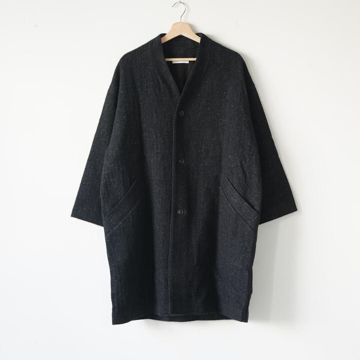 甘撚り糸を甘い打ち込みで練り上げた空気感を含んだ温かみのある生地、ウールリネン綾を使用したロングコート。