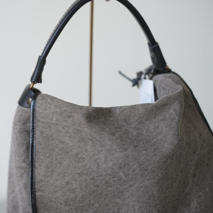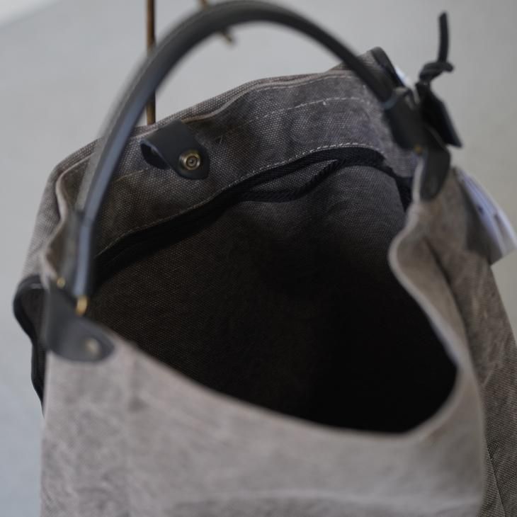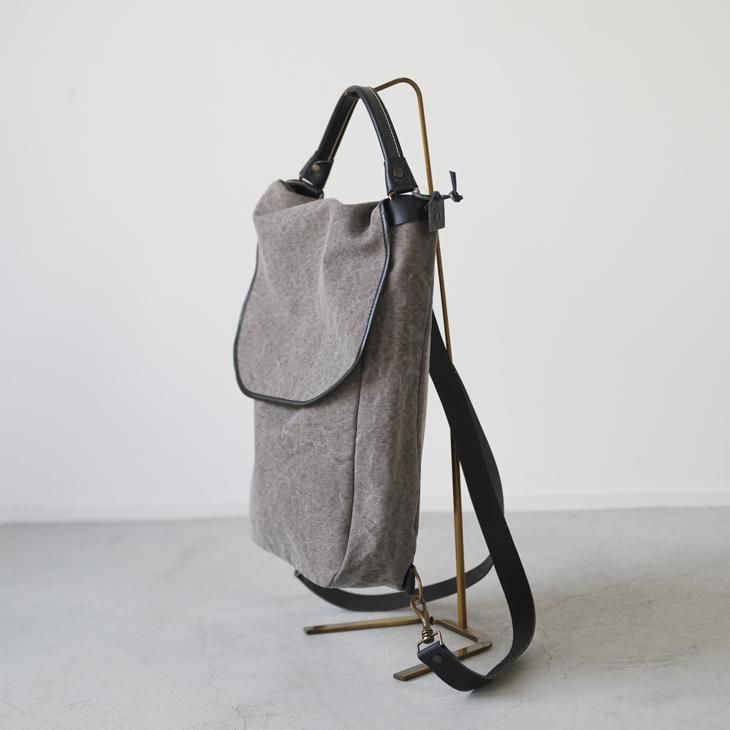 大きなフラップが印象的なバックパック。 「VIRGILLE BACK PACK」と名付けられたこのバッグは、「国籍や時代が抽象的な装いをする人にも似合うバッグを」という思いを込めて作られたデザインです。 ストーンウォッシュならではの味わいのあるコットンキャンバスをブラックのパーツで引き締めた、シックな存在感のあるバックパックです。