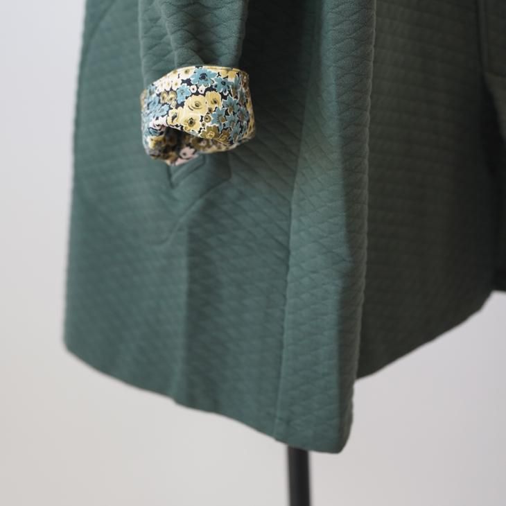 後衿見返しと袖口裏にリバティコーデュロイをあしらい、袖口を折り返せば気分が上がります。