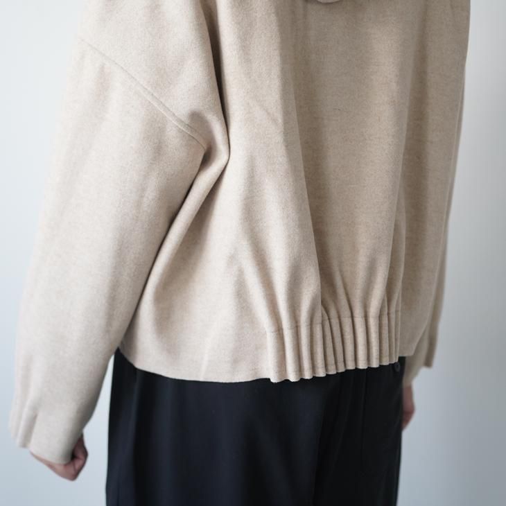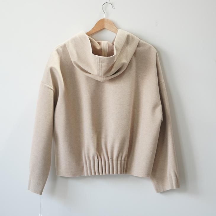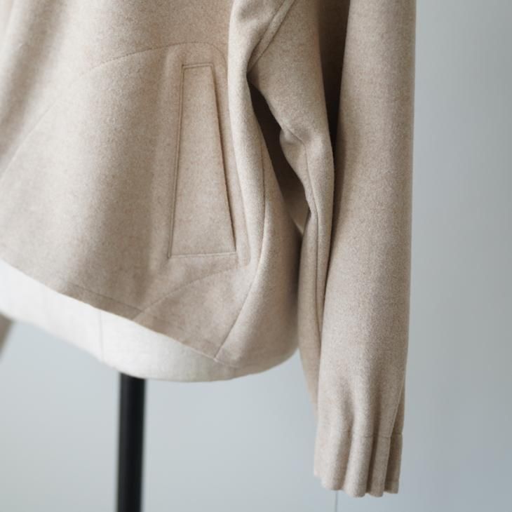 ポリエステル90%、レーヨン10%の少しストレッチ性があり、ウール、フェルトライクな肌触りのフードジャケット。