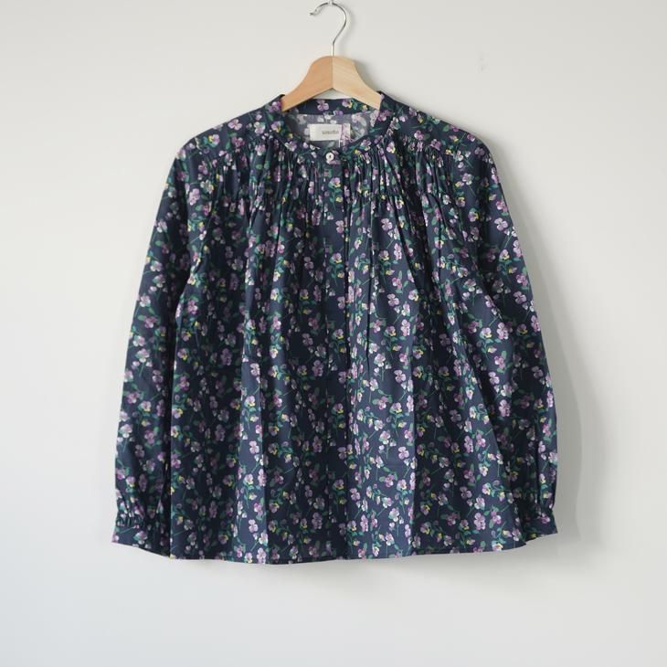 sosotto (ソソット) | LIBERTYタナローン胸シャーリングブラウス (black/navy) | トップス リバティ Pansy Scatter