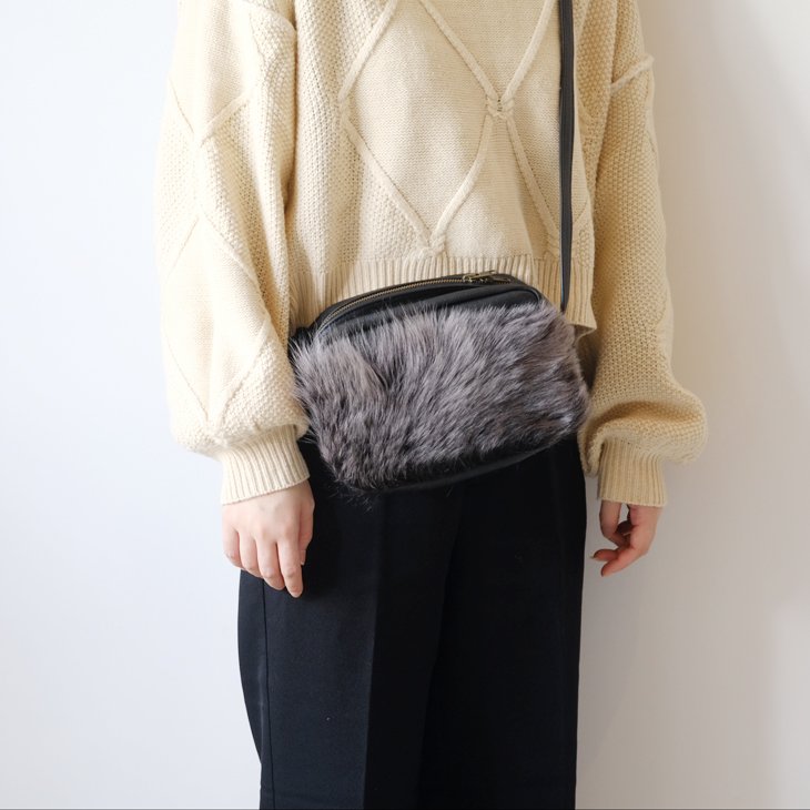 ドローコードのストラップがついたドラム型バッグ。bone brownと名付けられたふわふわのファーポケットを前面に大きくあしらったバッグ。