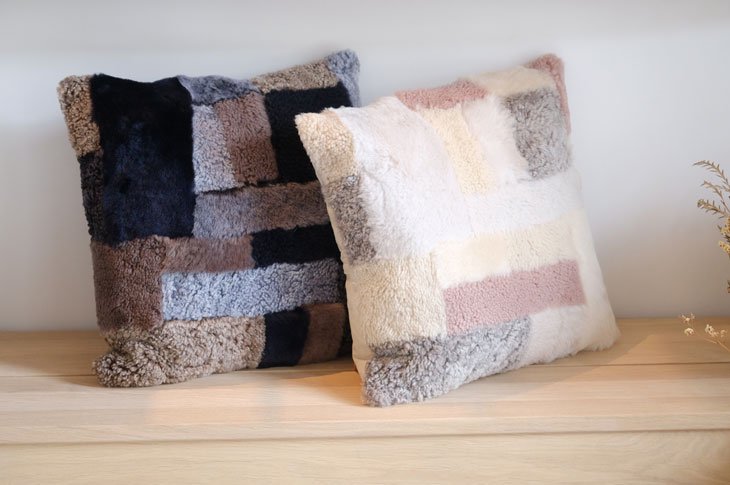 こちらは前面に様々なファーの生地をパッチワークにした一点もののクッションカバー。カラーはナチュラルとネイビーの2色が入荷しました。
