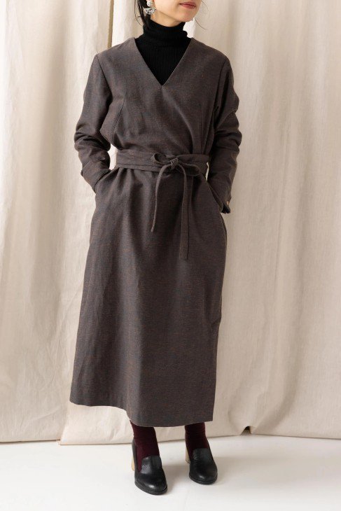 Vネックのリネン混のロングドレスの「grandma」もブラウンとブラックが再入荷しています。