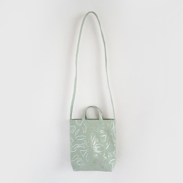 8号帆布につや消しの銀色の箔プリントを施したミニショルダーバッグ。