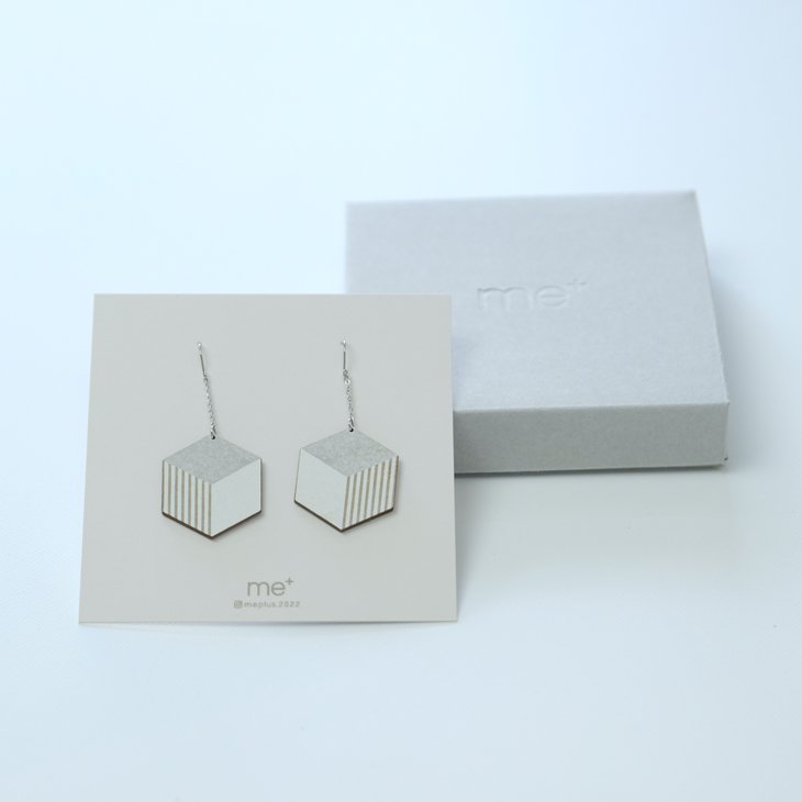 家具や内装の仕上げ材として使われるメラミン化粧板の廃材から作られたピアス。